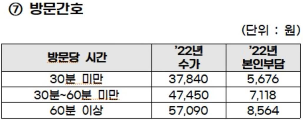 방문간호 같은 경우에는 수가가 30분 미만 시 37,840원, 60분 이상이면 57,090원입니다.