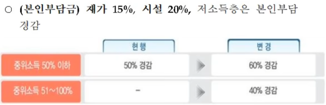 여기서 방문 요양이나 시설을 이용하시더라도 본인부담금이 나가게 되는데요. 재가 같은 경우는 15%, 시설은 20%가 본인 부담금으로 나가는데 저소득층은 본인부담금이 경감이 되어서 중에서도 50% 이하면 60%를 경감해주고 중위소득 100% 이하면 40% 경감해줍니다.