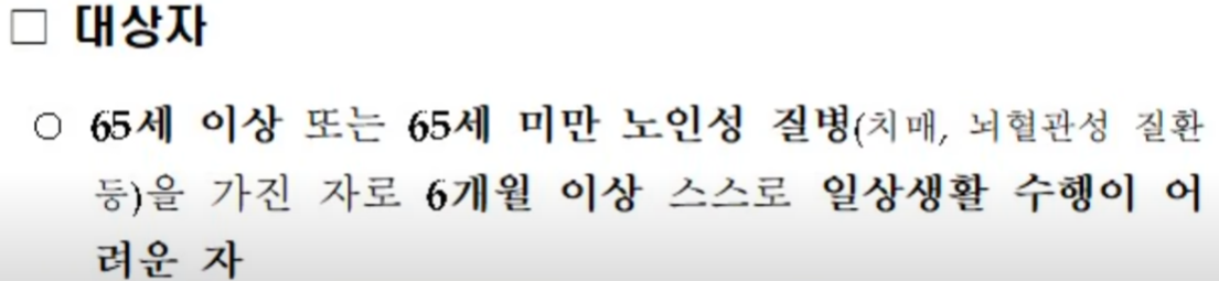 노인 장기요양 보험을 받을 수 있는 대상자는 만 65세 이상 또는 만 65세 미만의 노인성 질병(치매, 뇌혈관성 질환) 내 혈관성 질환 등을 가진 분들로 6개월 이상 스스로 일상생활 수행이 어려운 분들에게 노인장기요양보험을 지원하고 있습니다.